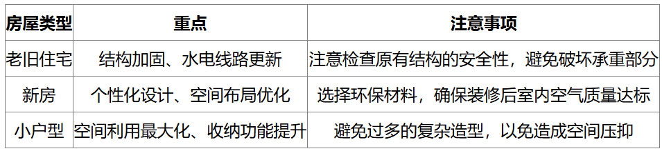 下面用一个表格来对比不同类型房屋改造的重点和注意事项: